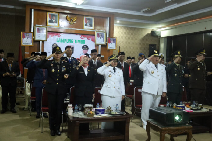 Suasana penuh rasa nasionalisme terasa saat para pejabat daerah tersebut berkumpul di Aula Utama Sekretariat Daerah Lampung Timur.